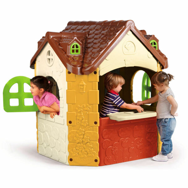 Una casita infantil de FEBER espaciosa con ventanas y puerta que abren y cierran.
