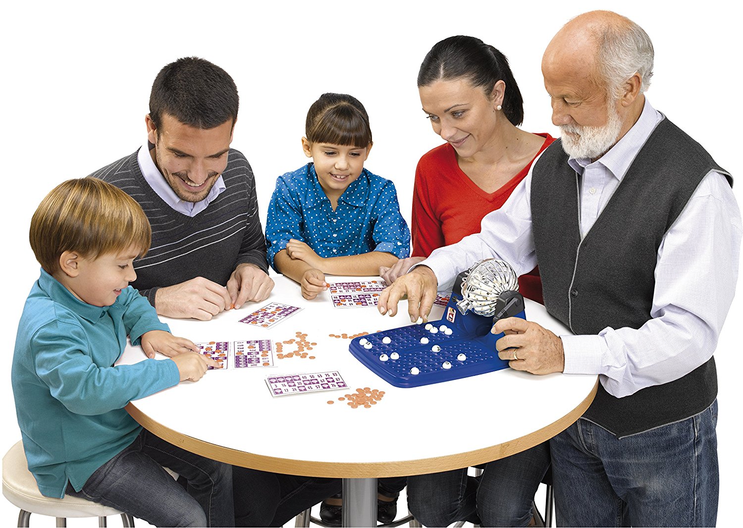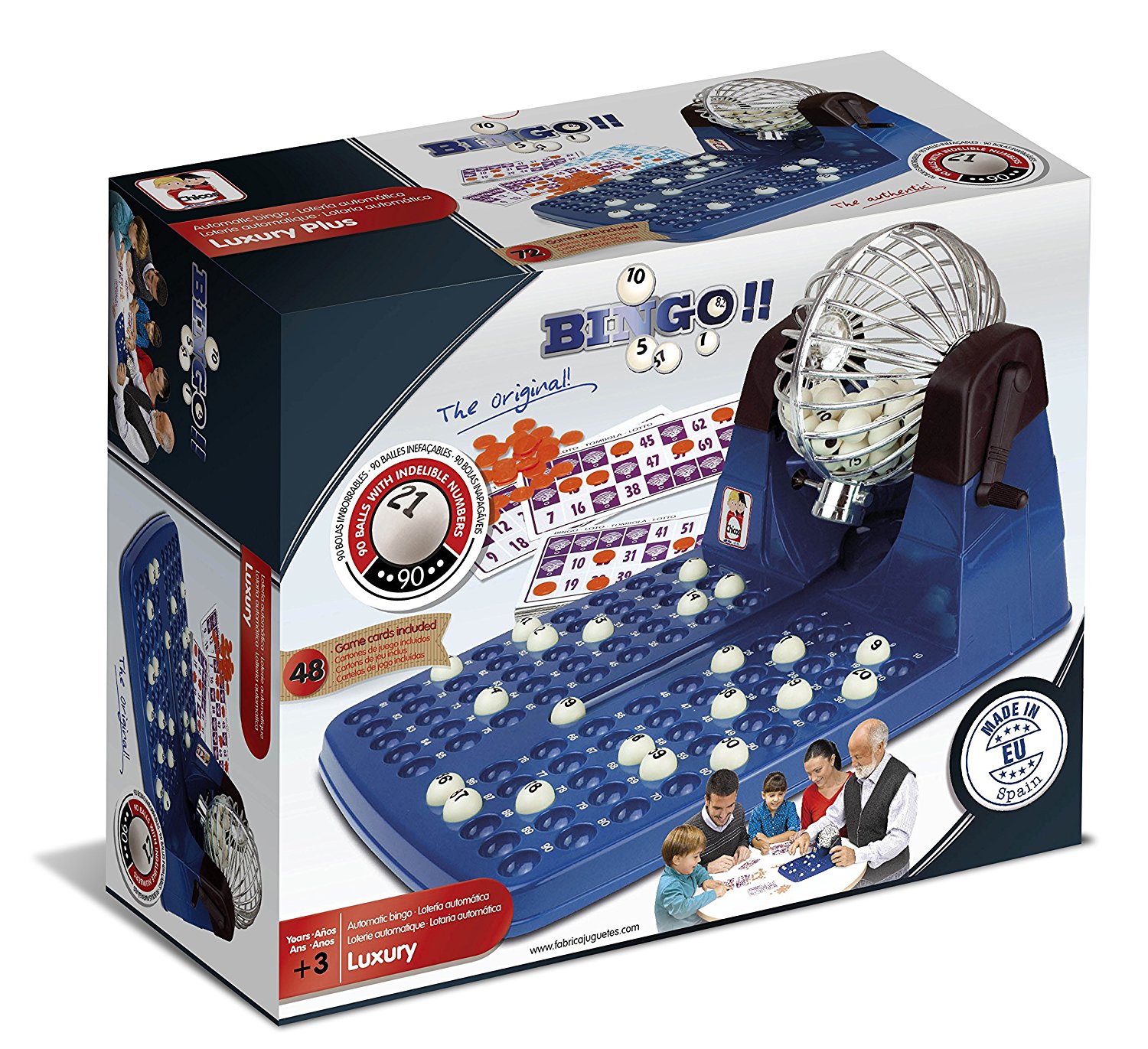 Bingo fammiliar de la marca española Juguetes Chicos. 48 cartones y fichas de juego Tamaño: 23.5 x 31 x 17 cm 90 bolas imborrables. Referencia fabricante 20805.