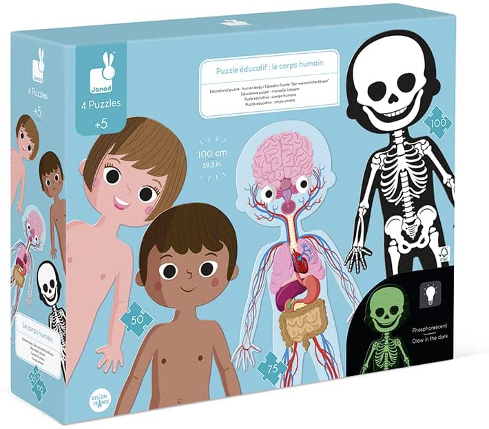 CARACTERÍSTICAS: Contiene fichas explicativas en 12 idiomas (francés, inglés, alemán, holandés, polaco, ruso, español, portugués, catalán, vasco, eslovaco, checo), 1 rompecabezas de 50 piezas de anverso / reverso para niña / niño, 1 de 75 piezas en los órganos, 1 puzzle de 100 piezas fosforescentes en el esqueleto. Dimensiones del rompecabezas: Largo 45 cm x Ancho 0.2 cm x Espesor 100 cm. Material (s) utilizado (s): Cartón. Rango de edad recomendado: a partir de 5 años