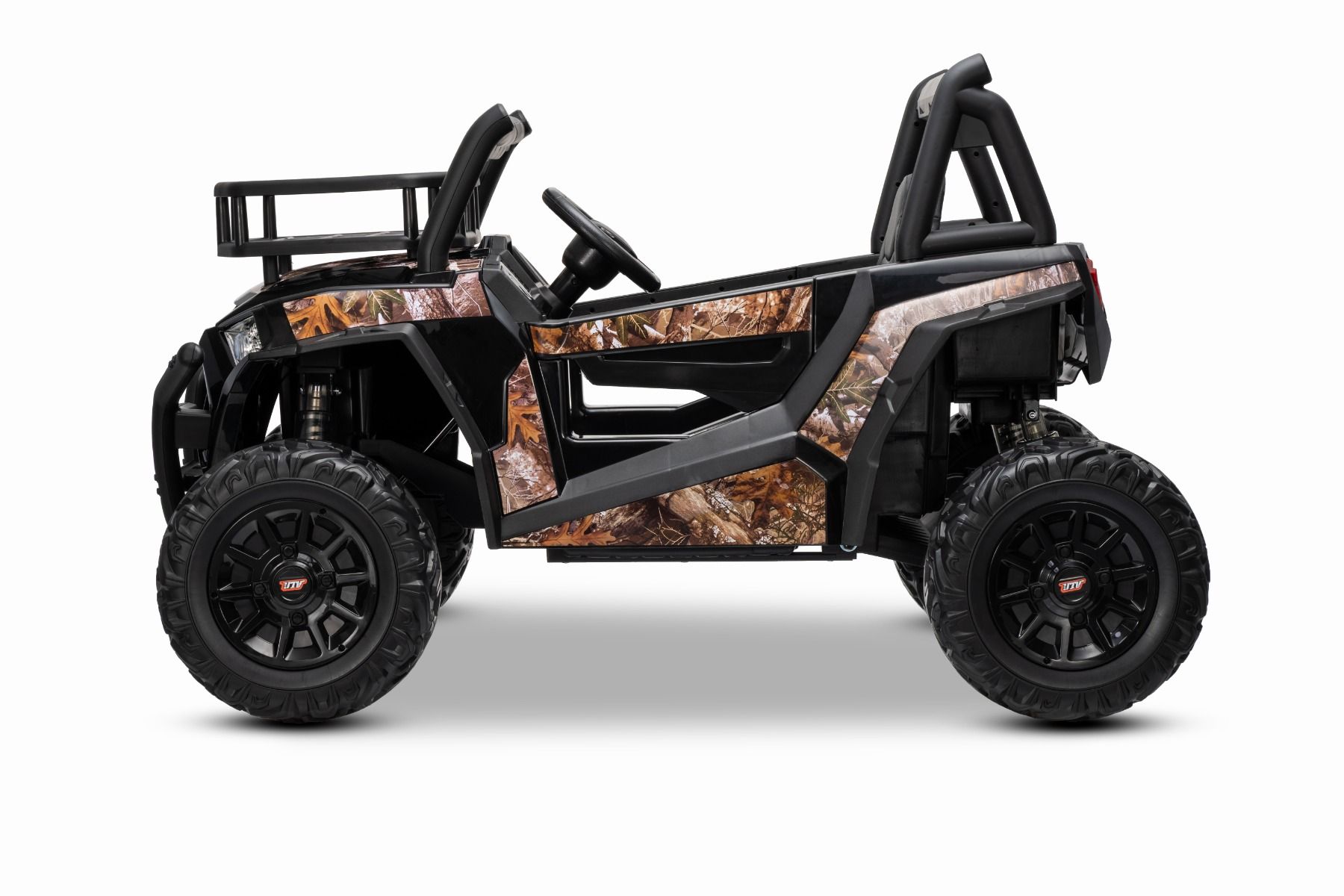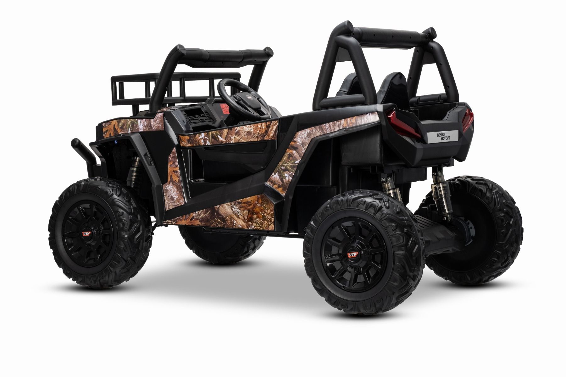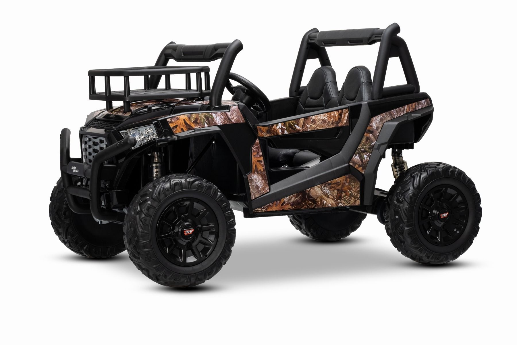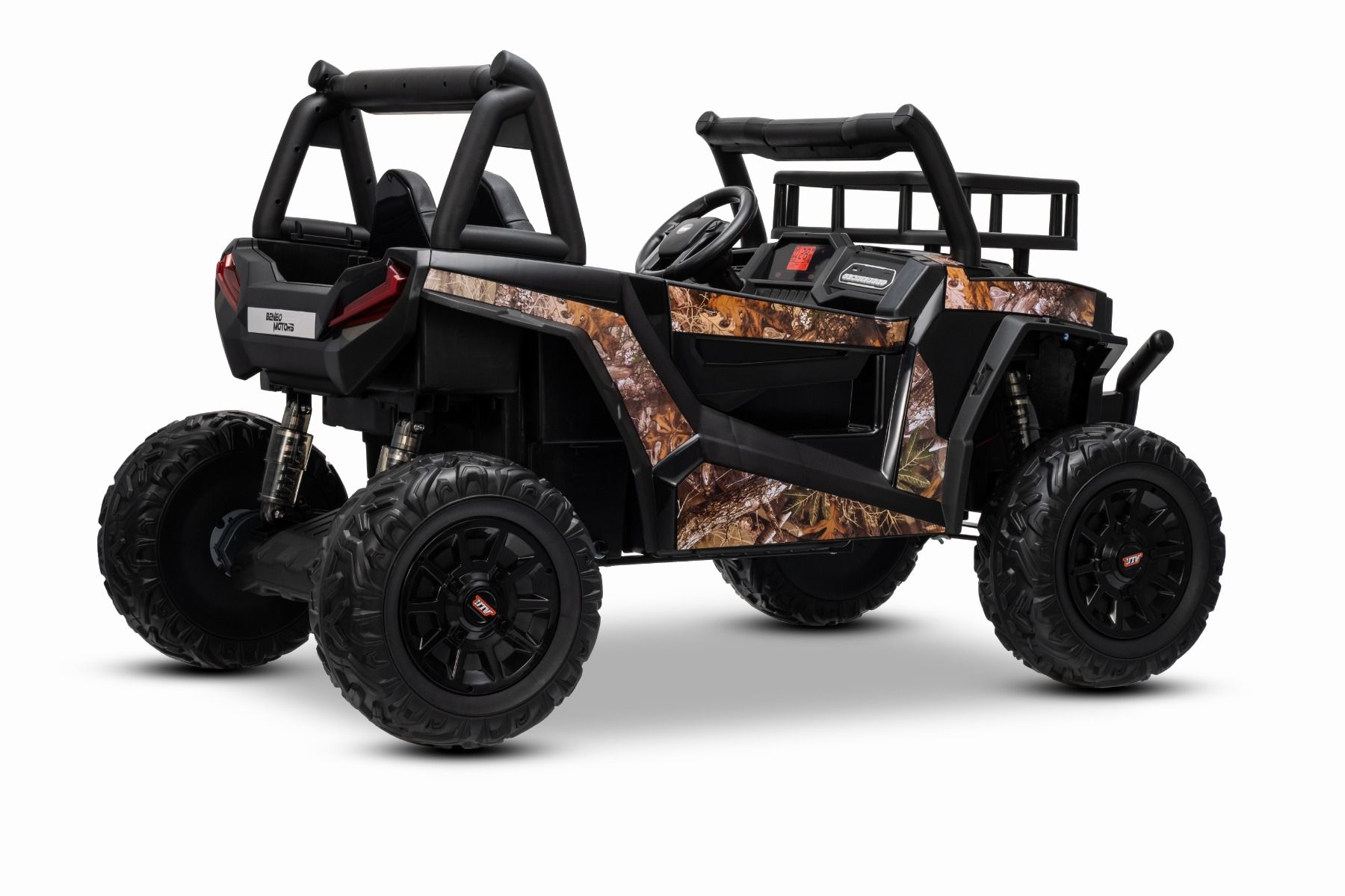 Nuevo control remoto de 2.4Ghz: sin interferencias, control total sobre el automóvil, parada de emergencia Apertura de puertas, efectos de sonido, indicador de estado de la batería Batería: Batería: Litio (22.2V 4.5AH) Luces led Max. carga: 100 Kg Dimensiones del coche: 136 x 87 x 85 cm Ruedas de plástico con banda centarl de goma y asientos dobles de cuero Suspensión en todas las ruedas Freno eléctrico en los motores 2x motores de 24v.