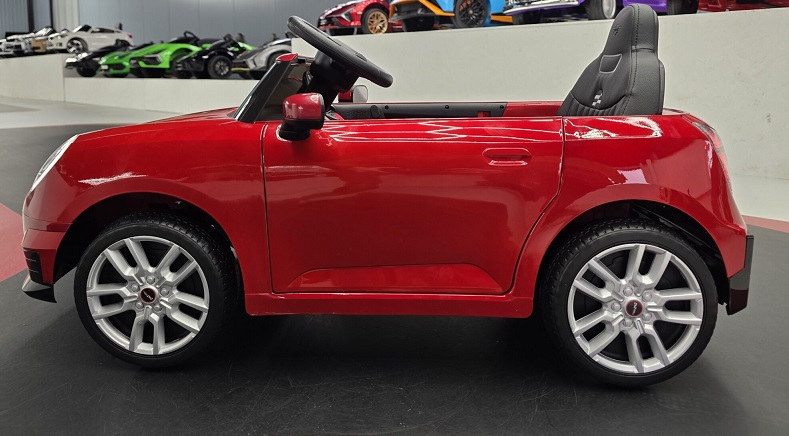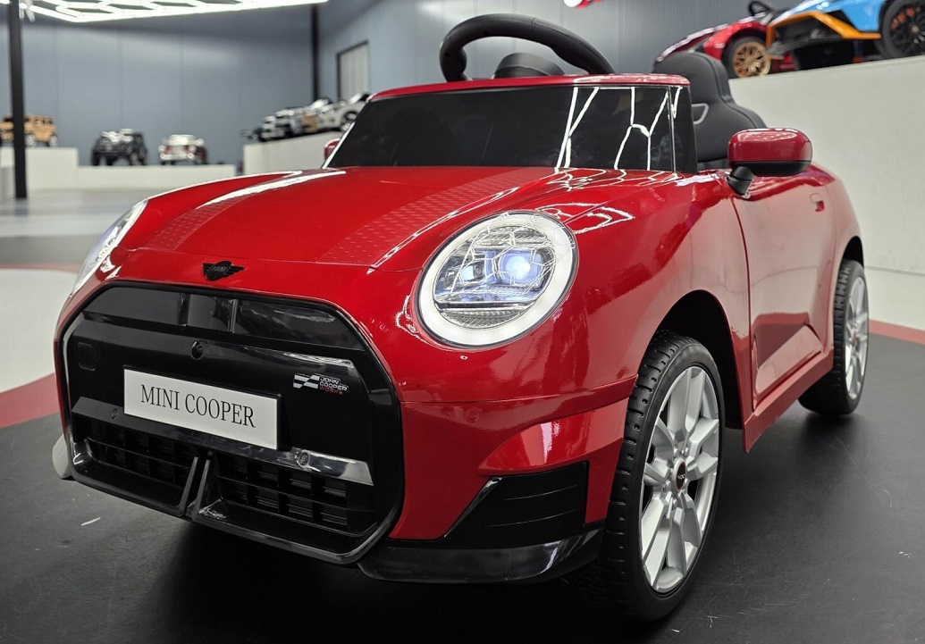 Este coche infantil Mini Cooper cuenta con luces delanteras, reproductor de MP3 y asiento de cuero.