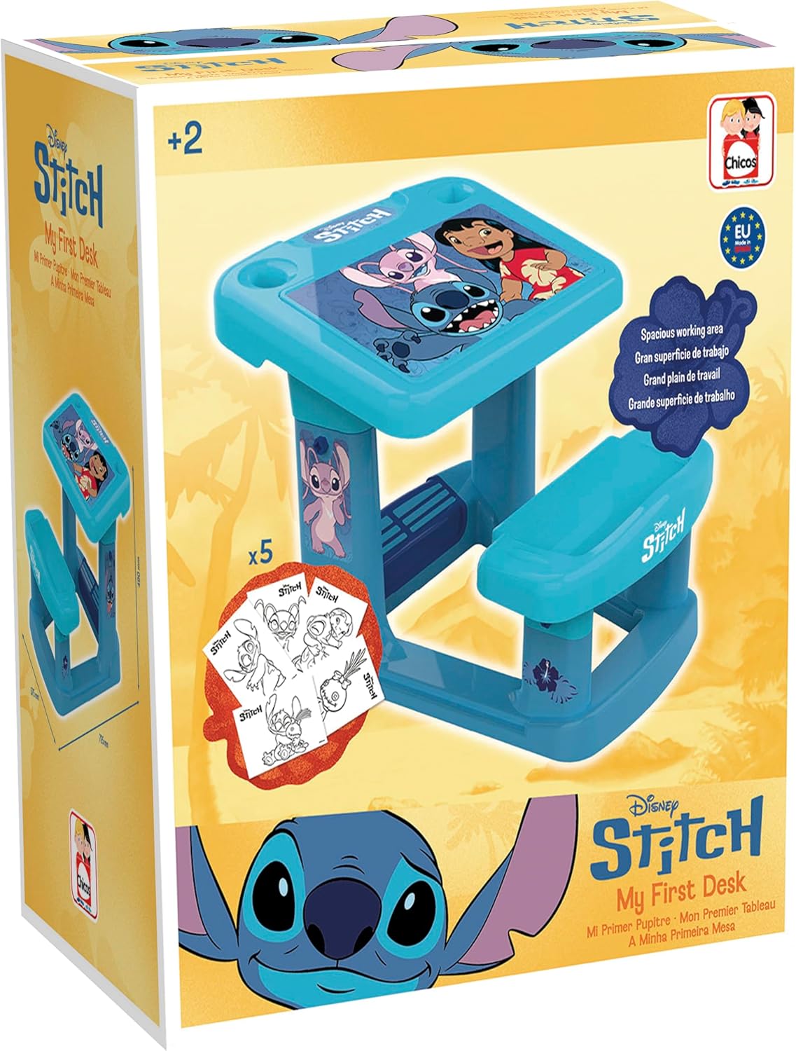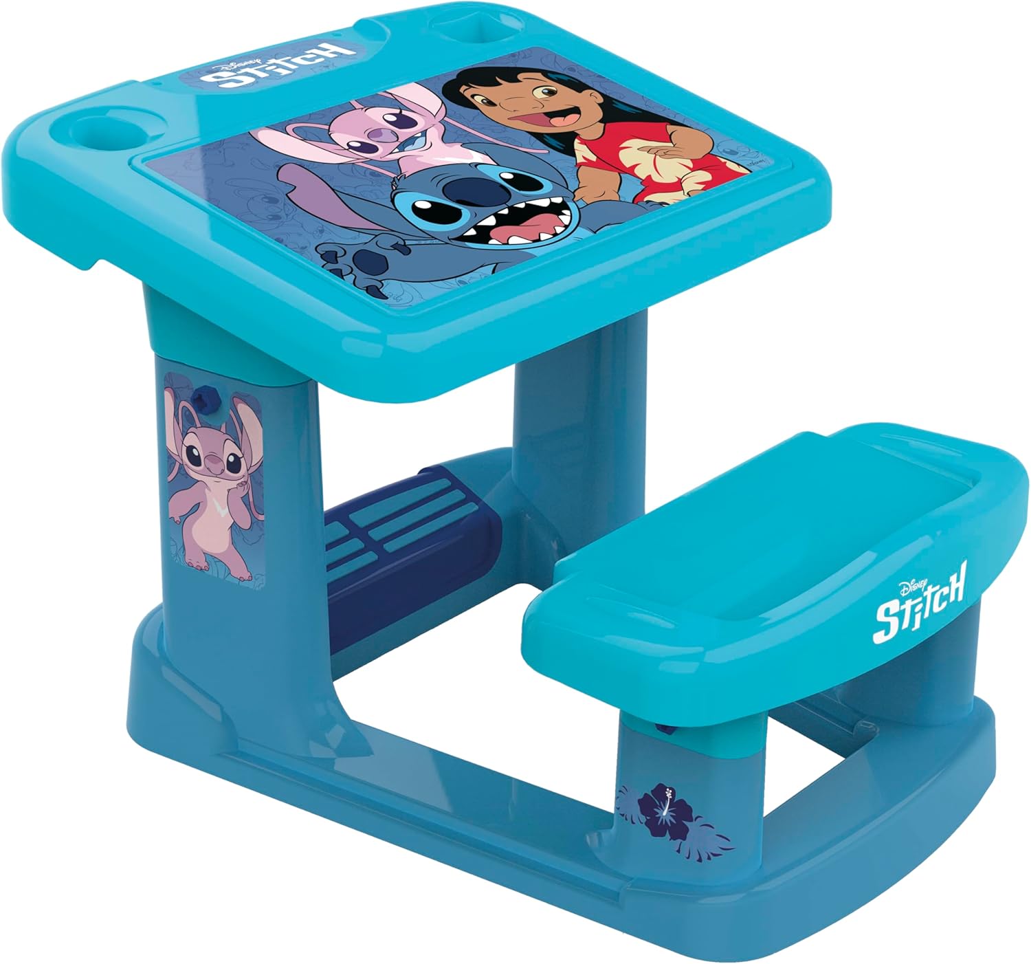 Este pupitre Stitch infantil de plástico está especialmente diseñado para niños a partir de 2 años, ofreciendo un espacio seguro y cómodo donde los más pequeños pueden jugar, pintar y aprender, adaptándose perfectamente a las necesidades de desarrollo y creatividad de los niños en sus primeros años. Además incluye 5 láminas de Stitch para colorear y 7 adhesivos temáticos, permitiendo que los pequeños personalicen y decoren su pupitre a su gusto. El pupitre cuenta con un tablero de escritura amplio que incluye prácticos huecos para bolígrafos y gomas de borrar, para mantener organizados todos los materiales escolares, como ceras, lápices de colores y rotuladores, evitando que se pierdan y fomentando el orden desde pequeños. Su diseño moderno y funcional se integra fácilmente en la decoración actual de las habitaciones infantiles, convirtiéndose en un elemento ideal tanto para el estudio como para el juego, y asegurando que los niños dispongan de un entorno atractivo y estimulante para desarrollar su imaginación y habilidades. Fabricado en plástico de óptima resistencia y durabilidad, este pupitre garantiza una larga vida útil incluso con el uso diario y la energía de los niños; sus medidas aproximadas de 57 x 72 x 49 cm lo hacen adecuado para espacios infantiles sin ocupar demasiado. El montaje del pupitre es sencillo y rápido, permitiendo que los padres lo instalen sin complicaciones; además, su banco cómodo y la gran superficie de trabajo aseguran horas y horas de diversión, entretenimiento y aprendizaje, convirtiéndolo en una excelente opción para la habitación de cualquier niño o niña.
